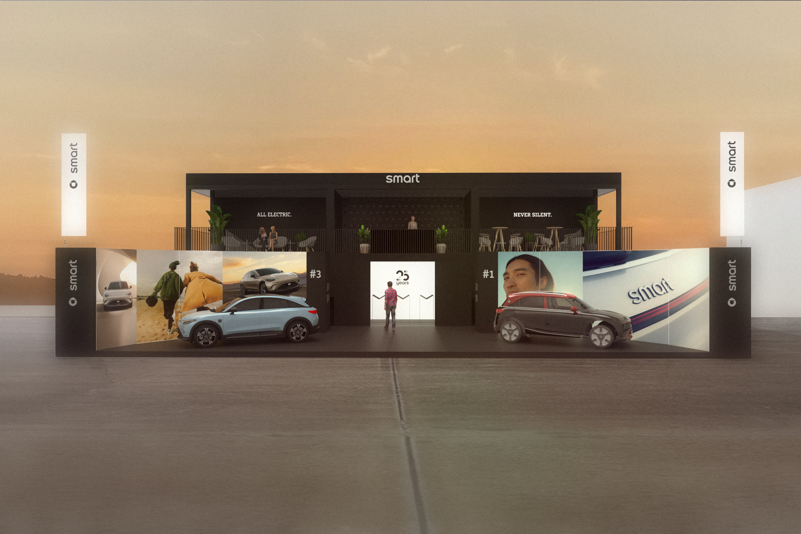 The #3, smart's second all-electric vehicle, made its European premiere at the IAA Mobility event in Munich, coinciding with the brand's 25th anniversary. smart set out to create an immersive and enlightening IAA experience. In the glamorous setting of the Film Casino, brand guests and industry VIPs were treated to an exclusive first look at the new vehicle. They were guided through a captivating, immersive experience spanning three floors. At the same time, the outdoor exhibition was open to the public, offering visitors the opportunity to admire both vehicles surrounded by two giant LED walls. Visitors were able to learn more about the vehicles' features and even take an exciting test drive.
